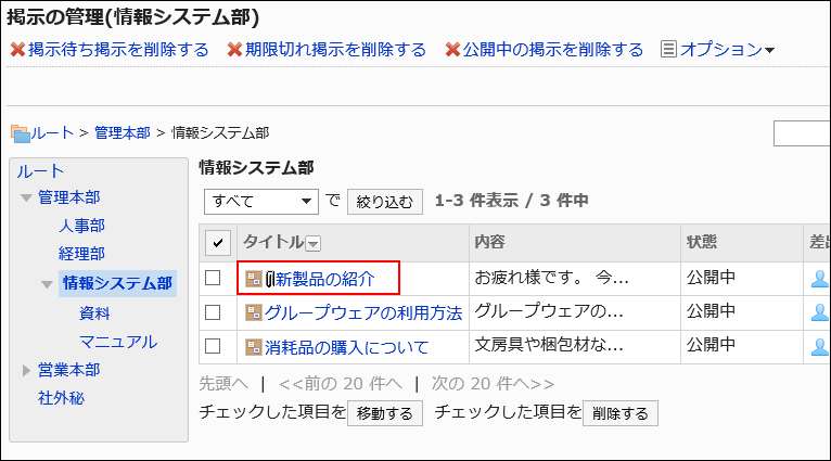 移動する掲示のチェックボックスを選択し、[移動する]をクリックします。