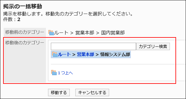 「掲示の移動」画面の「移動後のカテゴリー」項目で、移動先のカテゴリーを選択します。