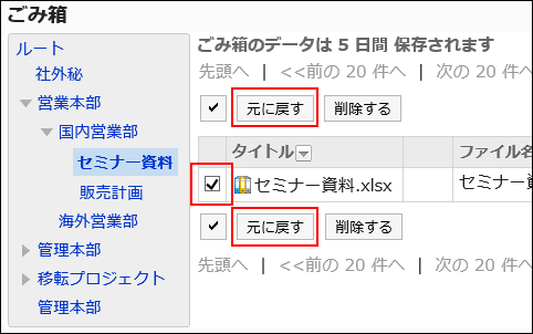 元に戻すファイルのチェックボックスを選択し、[元に戻す]をクリックします。