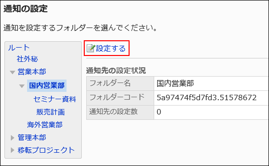 「通知の設定」画面で、フォルダーを選択し、[設定する]をクリックします。