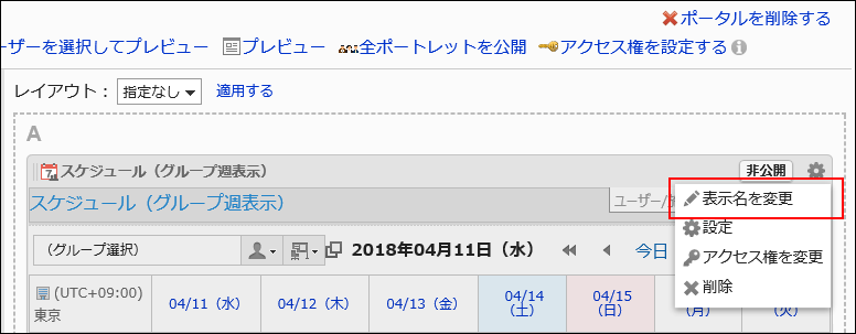 「ポータルの設定」画面で、表示名を変更するポートレットの歯車アイコン