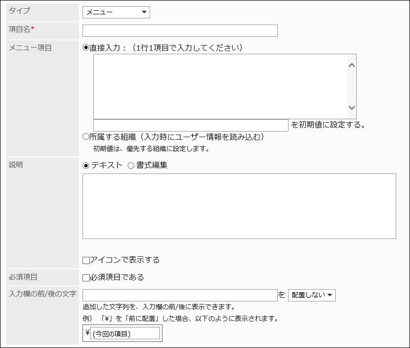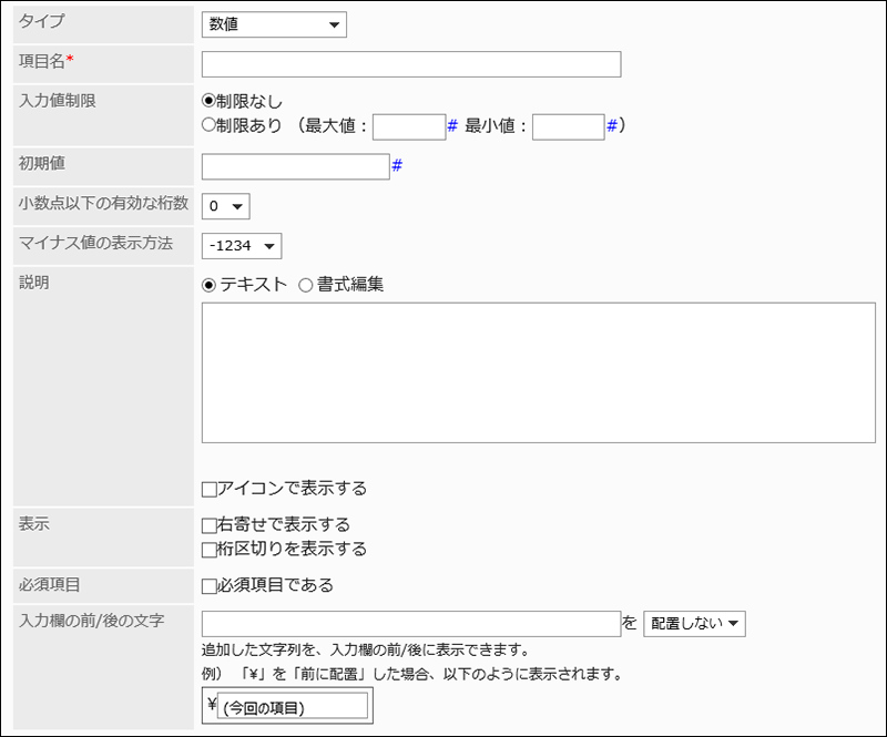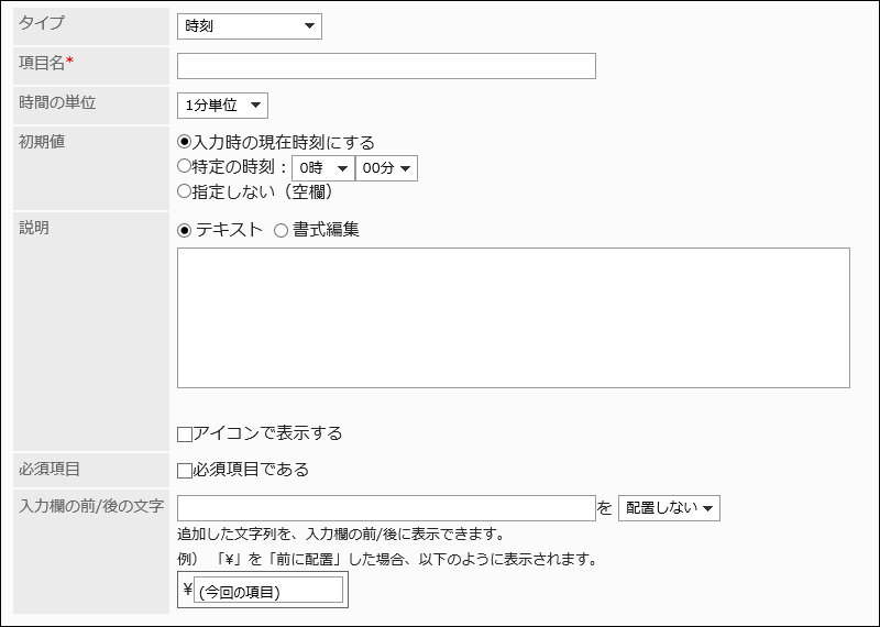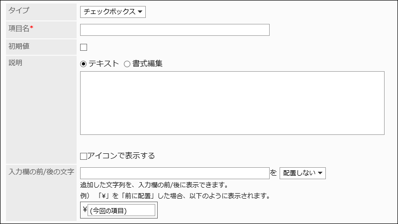 | 入力欄の前/後の文字 | 追加した文字列を、入力欄の前または後ろに表示できます。 文字列を入力し、表示する位置を設定します。