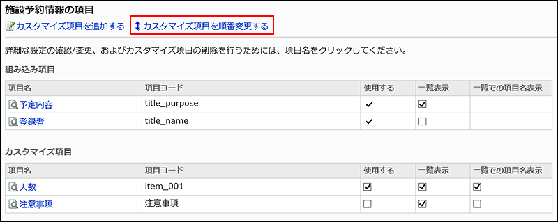 「施設予約情報の項目」画面で、[カスタマイズ項目を順番変更する]をクリックします。