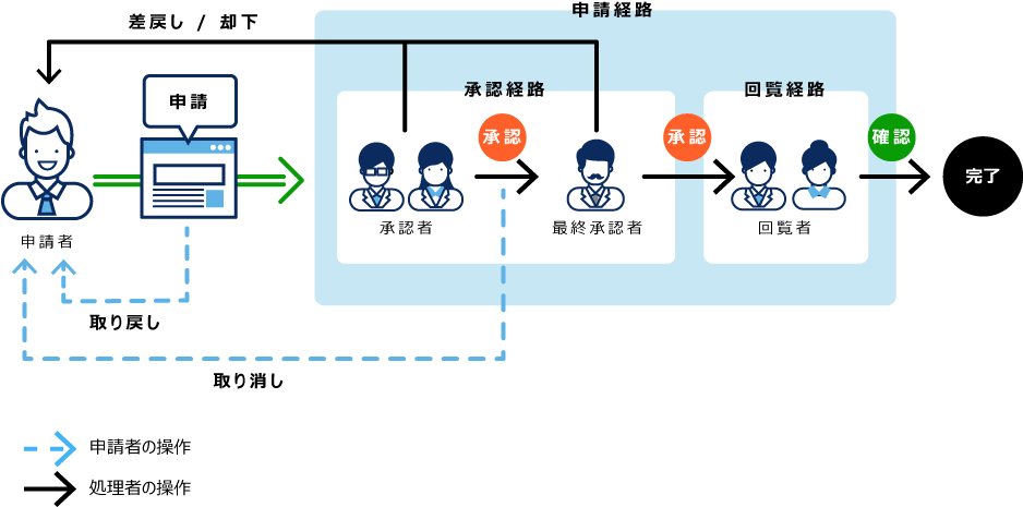 取り消し 申請者が、申請を撤回することを指します。申請を取り消した時点で、処理が終了します。