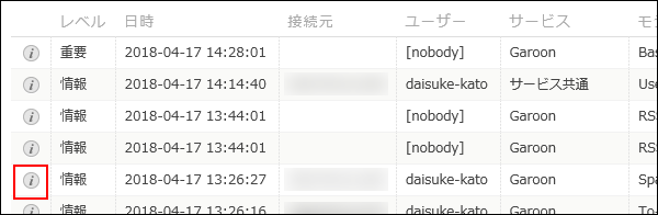 詳細を確認する場合は、監査ログの一覧で、[i]アイコンをクリックします。
