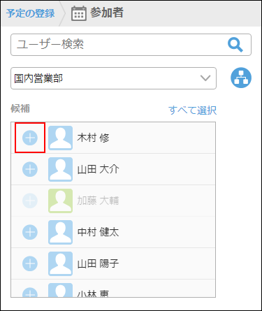 「候補」欄に表示されたユーザーの中から、予定の参加者に設定するユーザーや組織の