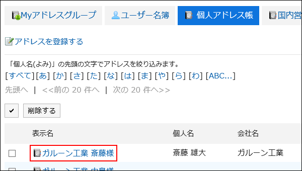 変更するアドレスの表示名をクリックします。