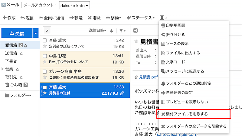 「メール」画面で、フォルダーを選択し、添付ファイルを削除します。