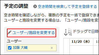 「予定の調整」画面で、[ユーザー/施設を変更する]をクリックします。