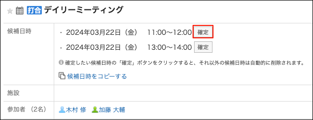 「予定の詳細」画面で、確定したい候補日時の[確定]をクリックします。