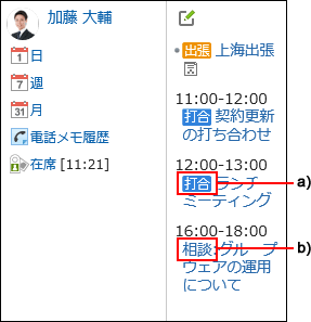 a) :システム管理者が設定した予定メニューを使用して登録した予定です。予定メニューに色が付きます。