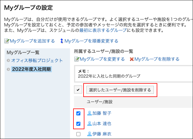 Myグループから削除するユーザーおよび施設のチェックボックスを選択し、[選択したユーザー/施設を削除する]をクリックします。