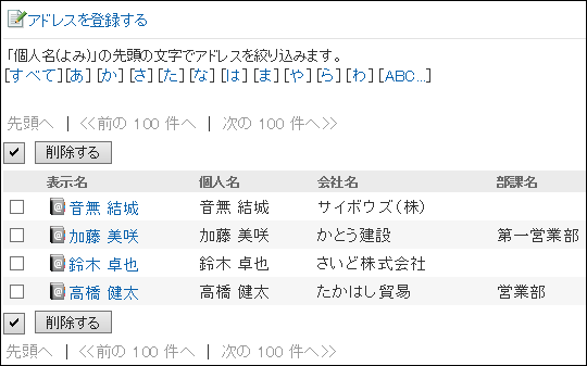 ほかのユーザーとアドレスを共有できる「共有アドレス帳」、ユーザー本人だけが使用できる「個人アドレス帳」、Garoonに登録されたユーザーを表示する「ユーザー名簿」があります。