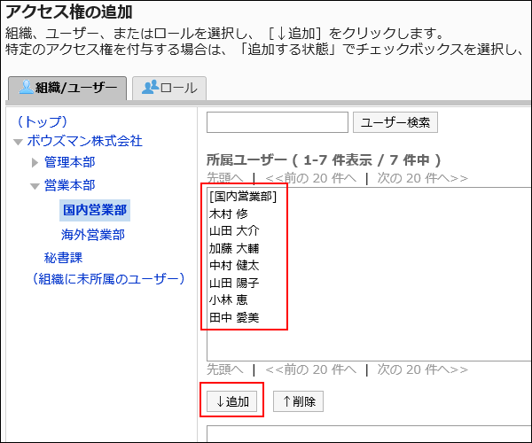 [追加]をクリックしたあとにタブをクリックすると、表示を切り替える前に選択した組織、ユーザー、またはロールの選択が解除されます。 -