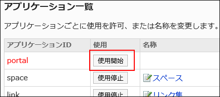 使用を停止したアプリケーションは、アプリケーションIDが赤色の文字になり、[使用開始]ボタンが表示されます。