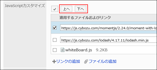 順番を変更するファイルやリンクのチェックボックスを選択し、[上へ]または[下へ]をクリックします。