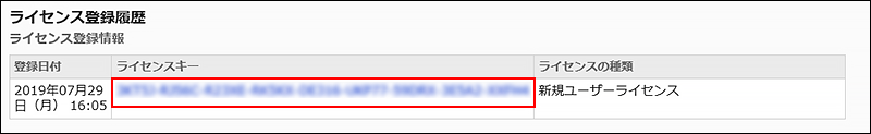 「ライセンス登録履歴」画面で、詳細を確認するライセンスキーをクリックします。
