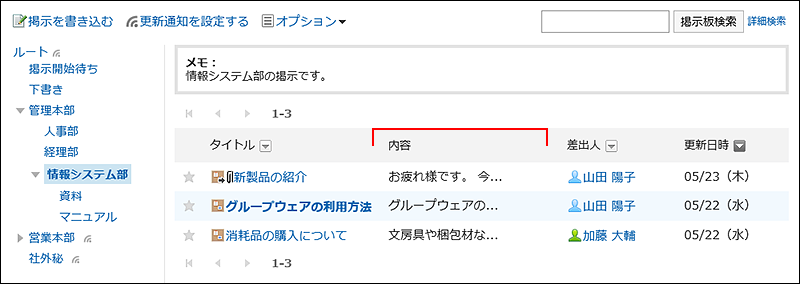 メッセージや掲示板などの詳細画面で、一度に表示するコメントの件数を設定します。 - 標題を表示する幅: