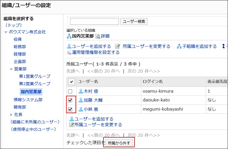6. 「組織/ユーザーの設定」画面で、組織を選択し、所属を外すユーザーのチェックボックスを選択して、[所属から外す]をクリックします。