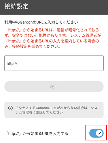 「接続設定」画面で、利用しているGaroonのURLを入力し、[次へ]をタップします。