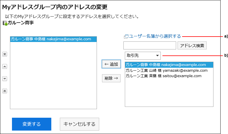 「Myアドレスグループ内のアドレスの変更」画面で、アドレスを追加または削除し、[変更する]をクリックします。
