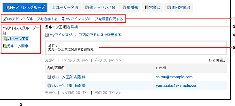 | 2 | Myアドレスグループ一覧: 追加したMyアドレスグループです。 |