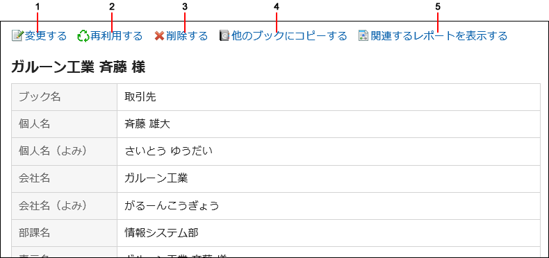 | 5 | [関連するレポートを表示する]のリンク: マルチレポートで作成したレポートが、アドレスに関連付けられている場合に表示されます。 クリックすると、レポートの一覧が表示されます。 |