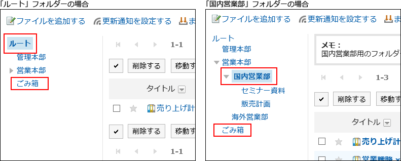 たとえば、ルートフォルダーに保存されていたファイルは、ルートフォルダーのごみ箱に、国内営業部のフォルダーに保存されていたファイルは、国内営業部のごみ箱にそれぞれ移動されます。