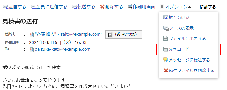 - 「メールの詳細」画面で、[オプション]の[文字コード]をクリックします。