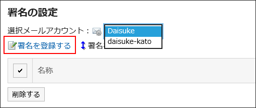 6. 「署名の設定」画面で、署名を登録するメールアカウントをドロップダウンリストから選択し、[署名を登録する]をクリックします。 署名を登録するの操作リンクが赤枠で囲まれている画像
