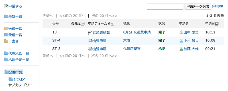 公開されている申請データの一覧です。カテゴリーごとに、最終承認者の処理が完了した申請データを確認できます。
