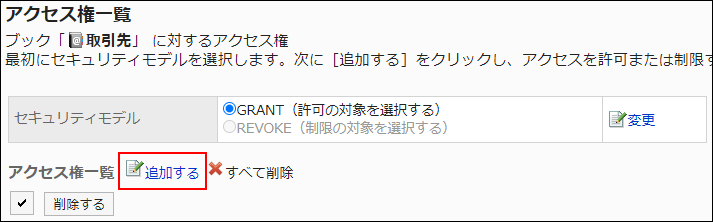 セキュリティモデルが「GRANT(許可の対象を選択する)」の状態で、アクセス権を設定する場合を例に説明します。
