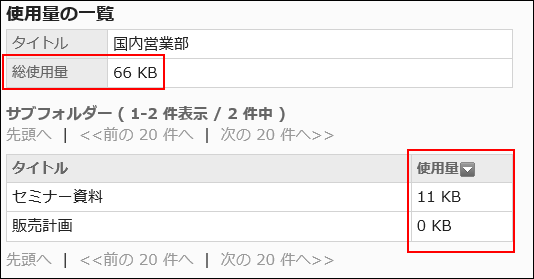 「使用量の一覧」画面で、フォルダーの使用量を確認します。