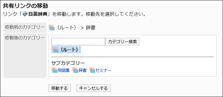 キーワードを入力し、[カテゴリー検索]をクリックすると、移動先の共有カテゴリーを検索できます。