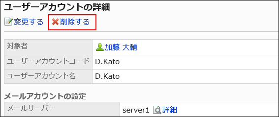 「ユーザーアカウントの詳細」画面で、[削除する]をクリックします。