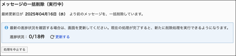 「メッセージの一括削除(実行中)」画面が表示されます。画面を更新すると、削除処理の最新の進捗状況を確認できます。