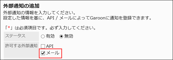 7. 「外部通知の追加」画面の「許可する外部通知」項目で、「メール」のチェックボックスを選択します。