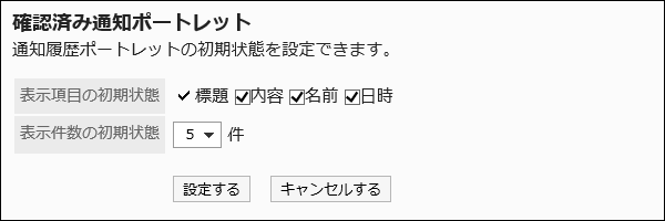 「確認済みの通知」ポートレットに表示する項目や、表示する通知の件数の初期値を設定します。