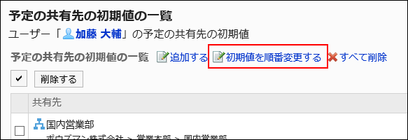7. 「予定の共有先の初期値の一覧」画面で、[初期値を順番変更する]をクリックします。