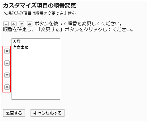 「カスタマイズ項目の順番変更」画面で、カスタマイズ項目の順番を変更します。