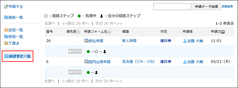 承認予定一覧の使用を許可すると、ユーザーは、「ワークフロー(承認予定一覧)」画面で、自分が処理者に設定されている申請データの進行状況を確認できます。