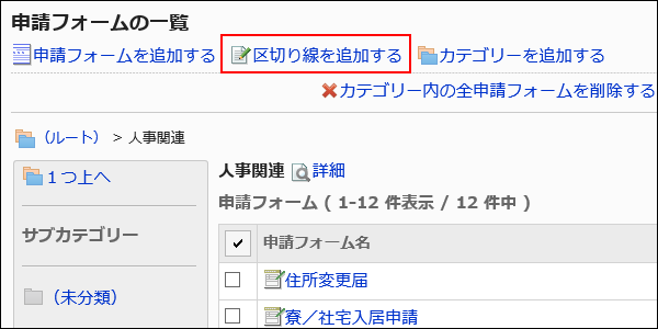 「申請フォームの一覧」画面で、カテゴリーを選択し、[区切り線を追加する]をクリックします。