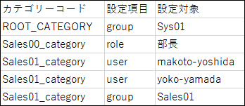 カテゴリーのセキュリティモデルを設定します。フォーマットは次のとおりです。カテゴリーコード,設定項目,設定値 - アクセス権を設定する行: