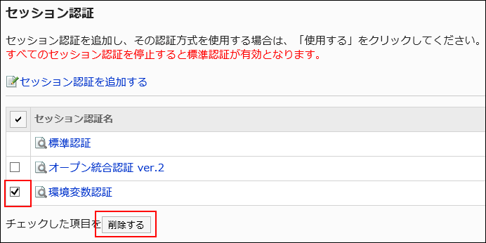 「セッション認証」画面で、削除するセッション認証のチェックボックスを選択し、[削除する]をクリックします。