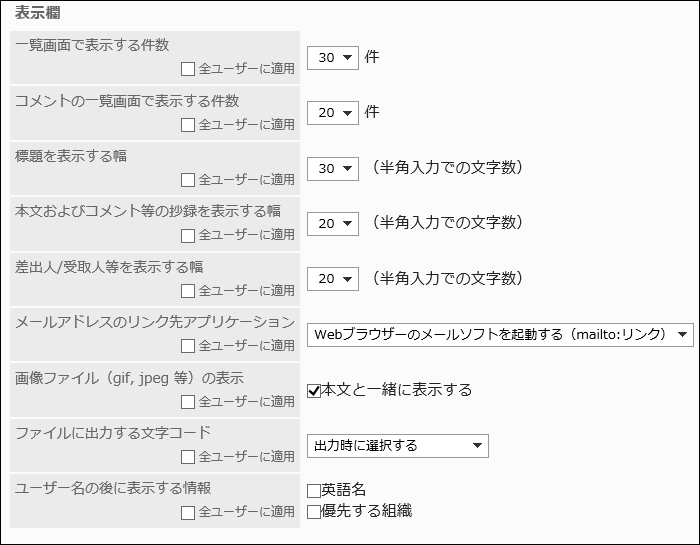 メッセージや掲示板などの一覧画面に表示する本文およびコメントの文字数を設定します。文字数は、半角入力での文字数です。
