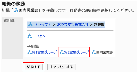 「組織の移動」画面で、移動先の親組織を選択し、[移動する]をクリックします。