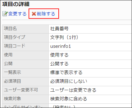 「ユーザー情報の項目」画面で、削除する項目の項目名をクリックします。