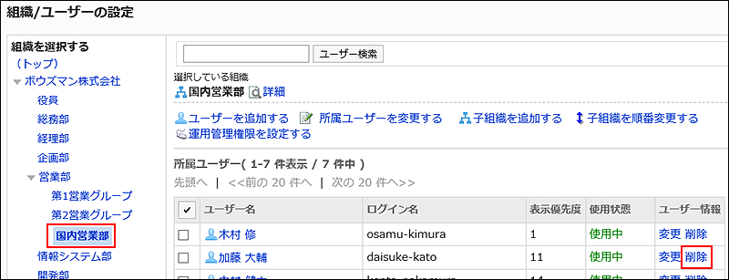 「組織/ユーザーの設定」画面で、組織を選択し、削除するユーザーのユーザー名をクリックします。