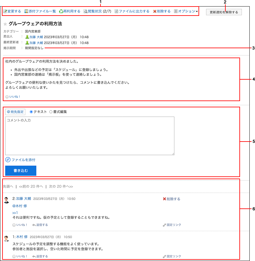 掲示の差出人と、掲示の変更、および削除を許可されたユーザーだけに表示されます。