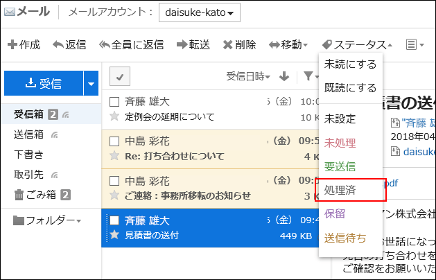 「メール」画面で、フォルダーを選択し、ステータスを設定します。